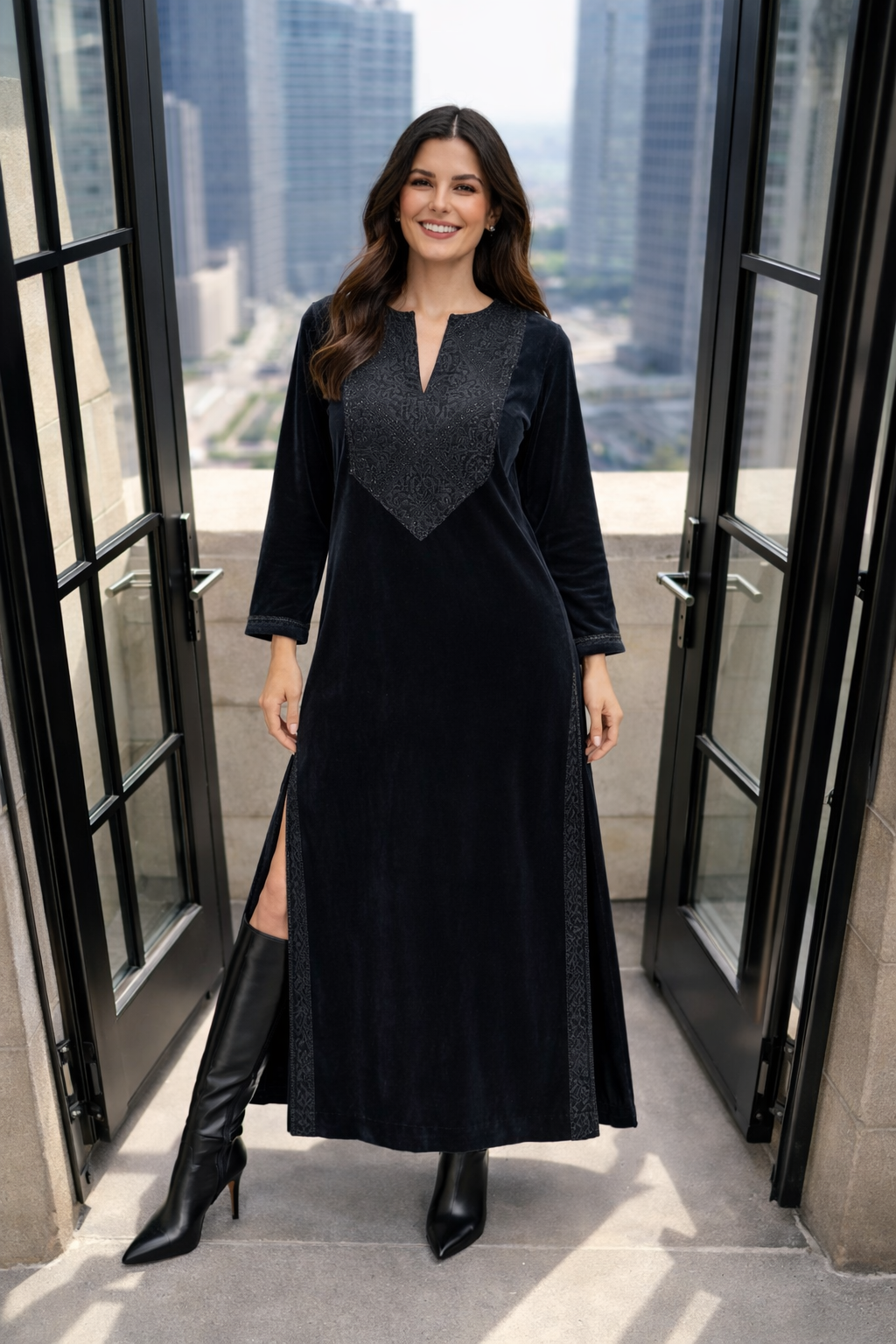 The Noir Tatreez Split Dress is a timeless black velvet piece featuring intricate black-on-black embroidery inspired by Palestinian tatreez. Designed with a refined V-neckline, long...