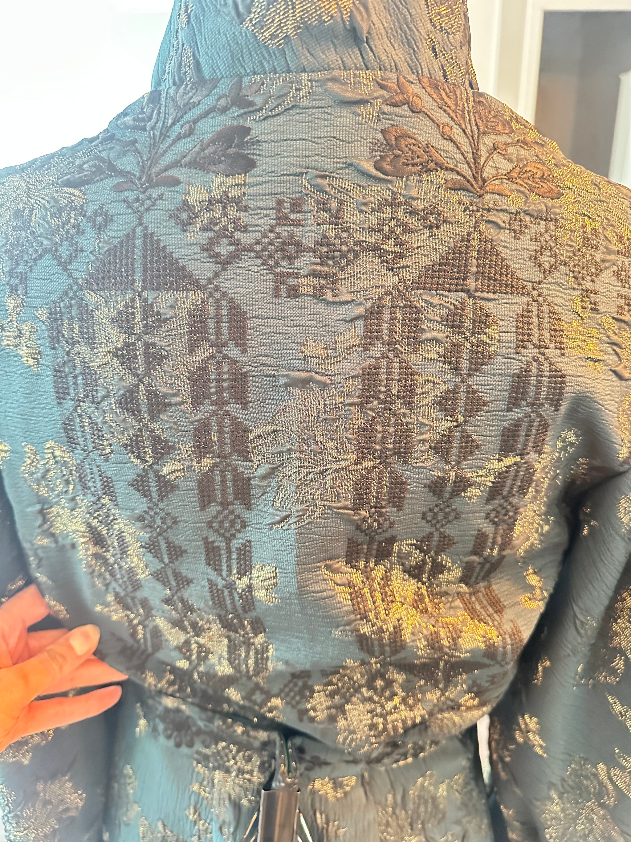 Elevate your wardrobe with this exquisite handmade embroidered blazer, a timeless piece that blends luxury fashion with Palestinian heritage craftsmanship. Designed from premium satin...
