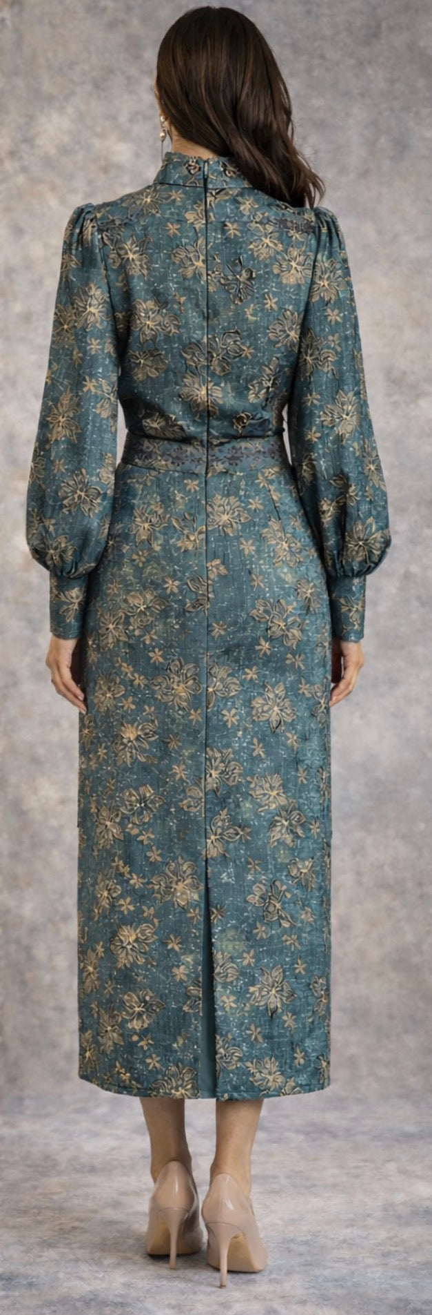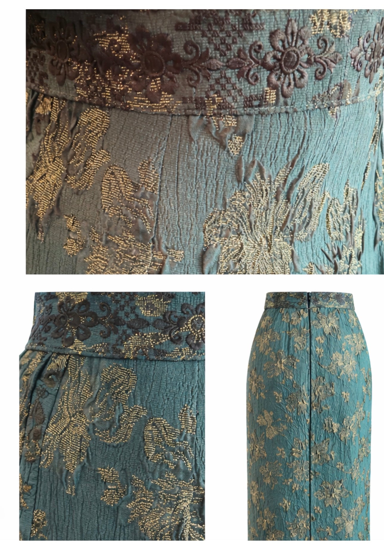A timeless midi skirt crafted from rich teal brocade, woven with delicate gold floral motifs that reflect depth, texture, and quiet luxury. Designed with...