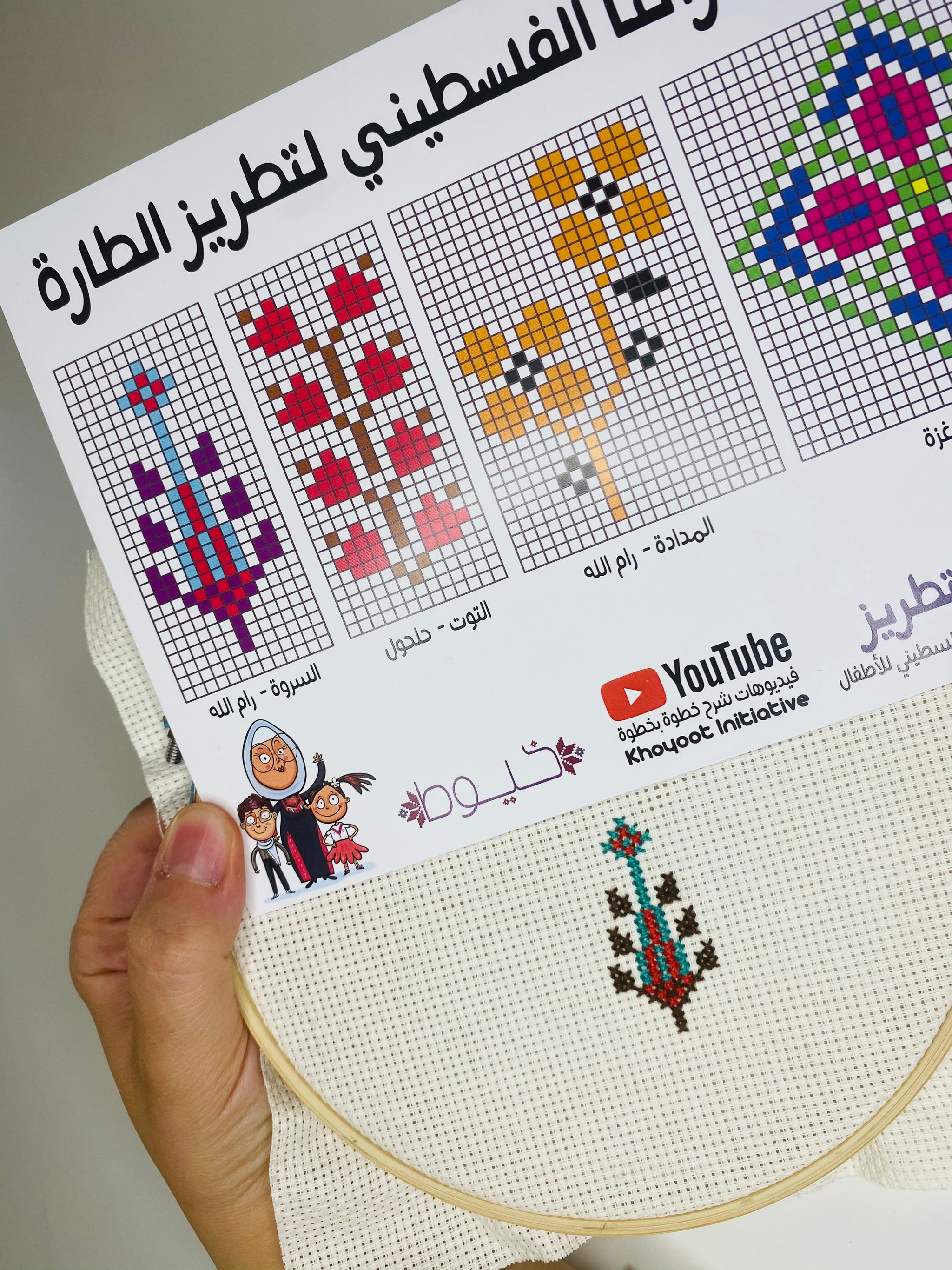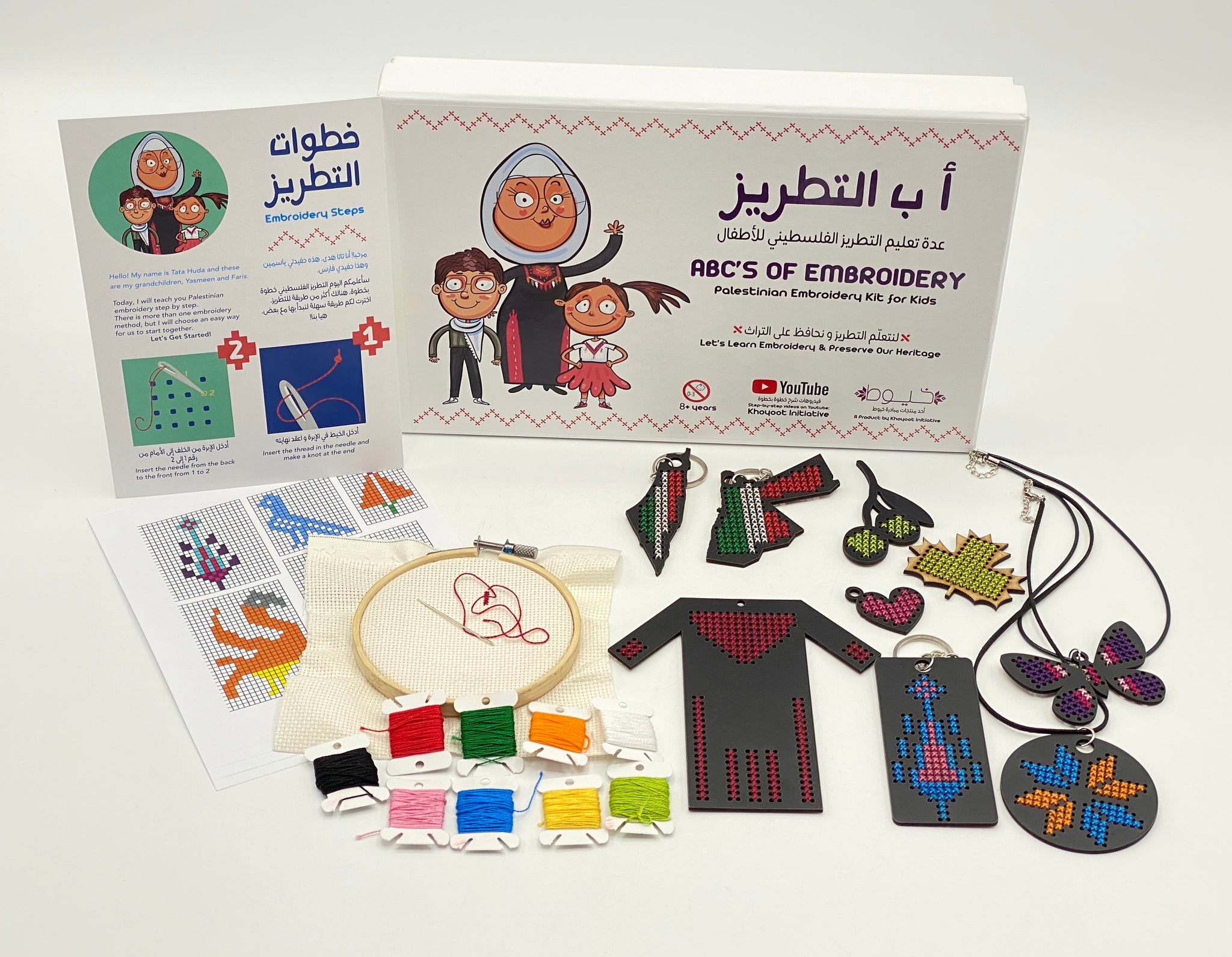 Kit Includes: Embroidery steps explained by Tata Huda,Yasmeen and FarisA Wooden embroidery hoop with fabric and embroidery patterns from our Palestinian heritage9 Wooden cross stitch...